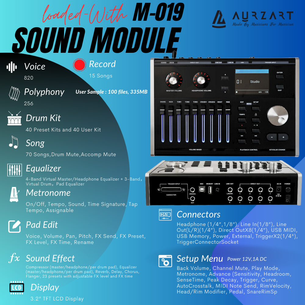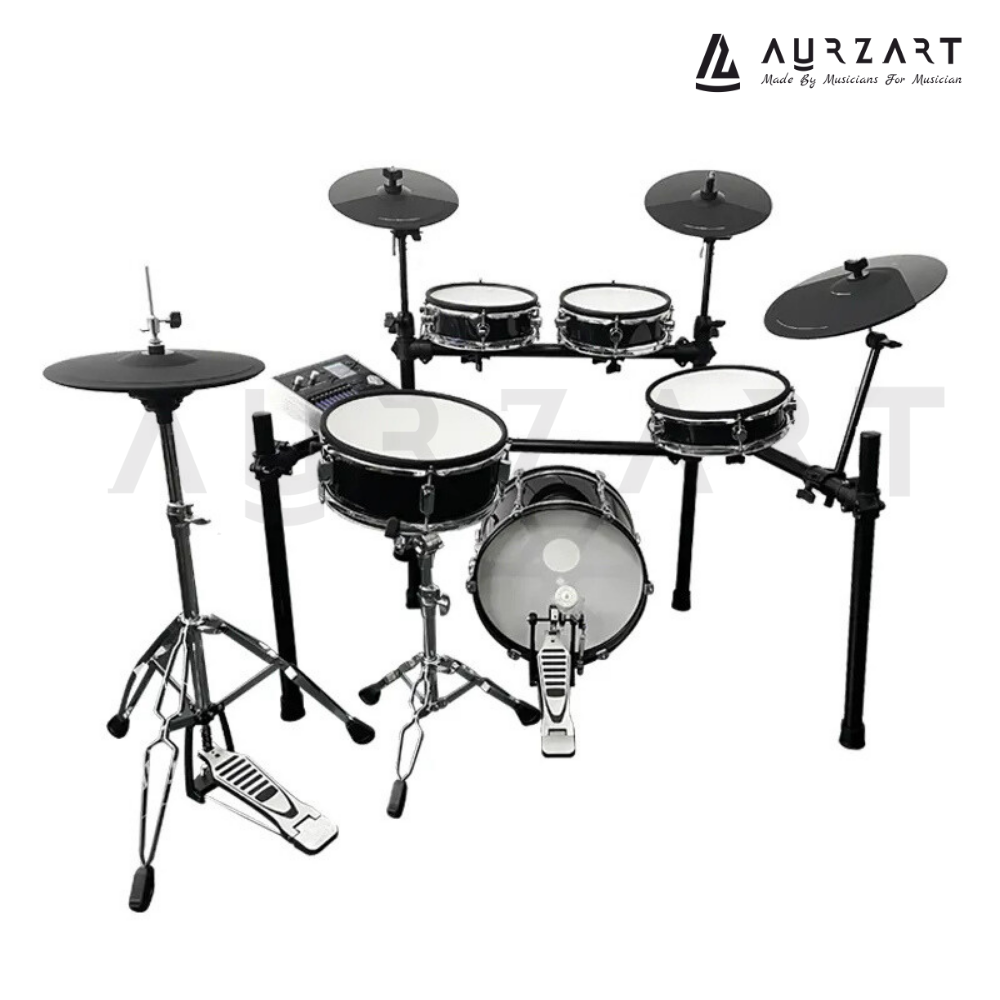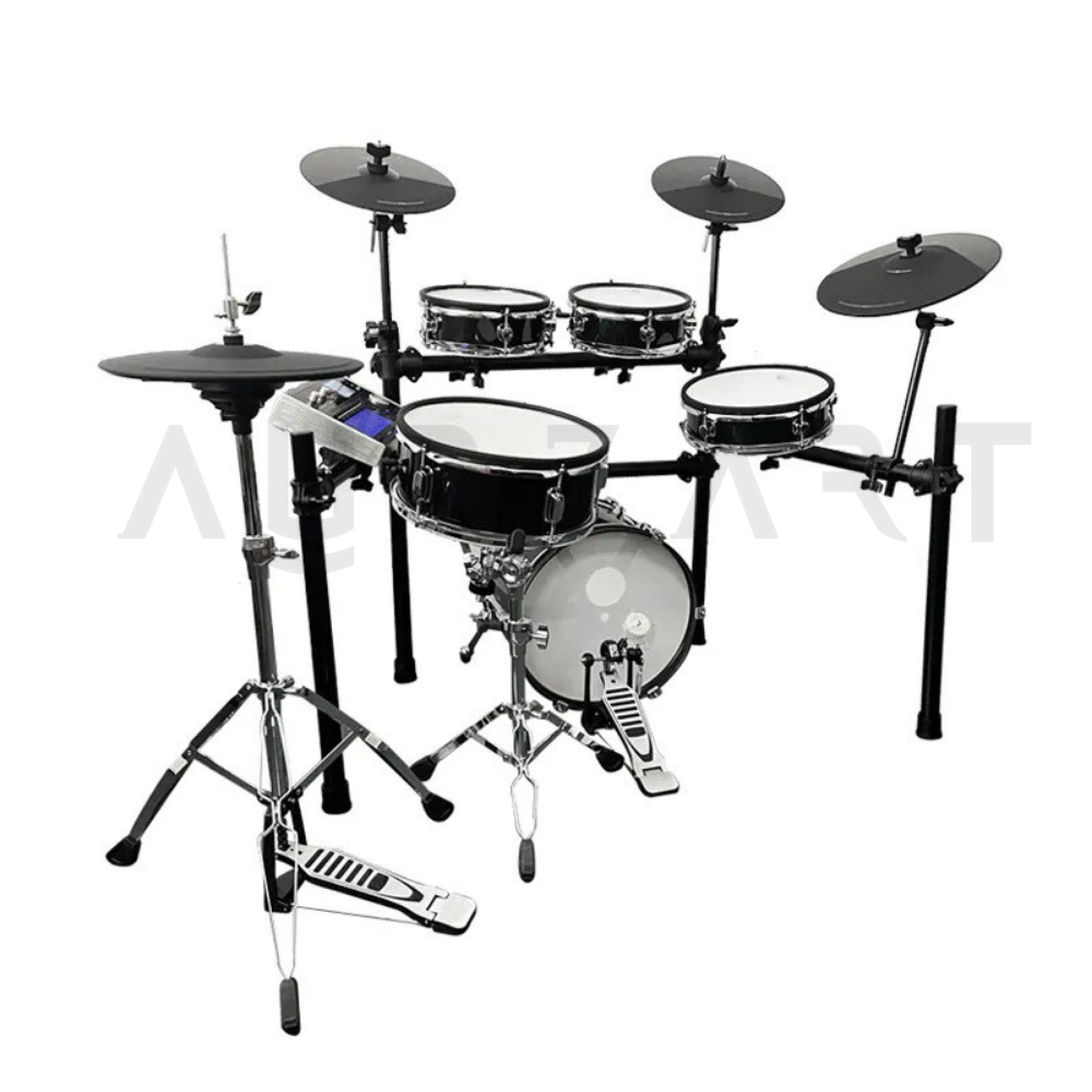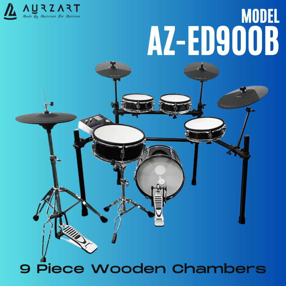 The Aurzart AZ-ED900B-KM Wooden Mesh Head Electronic Drums 9 Piece offers a configuration of 2 X 10" and 1 X 12" acoustic mesh toms, a 14" acoustic mesh snare, 2 X 12" crash cymbals, 14" ride cymbal, 13" hi-hat with stand, and a 16" acoustic mesh kick. With advanced features such as a sound module boasting 820 voices and 256 polyphony, 40 preset and user kits, 70 songs with drum and accompaniment mute options, and customizable sound effects and equalizers, this drum set is perfect for musicians and professionals seeking a high-quality, versatile electronic drumming experience.