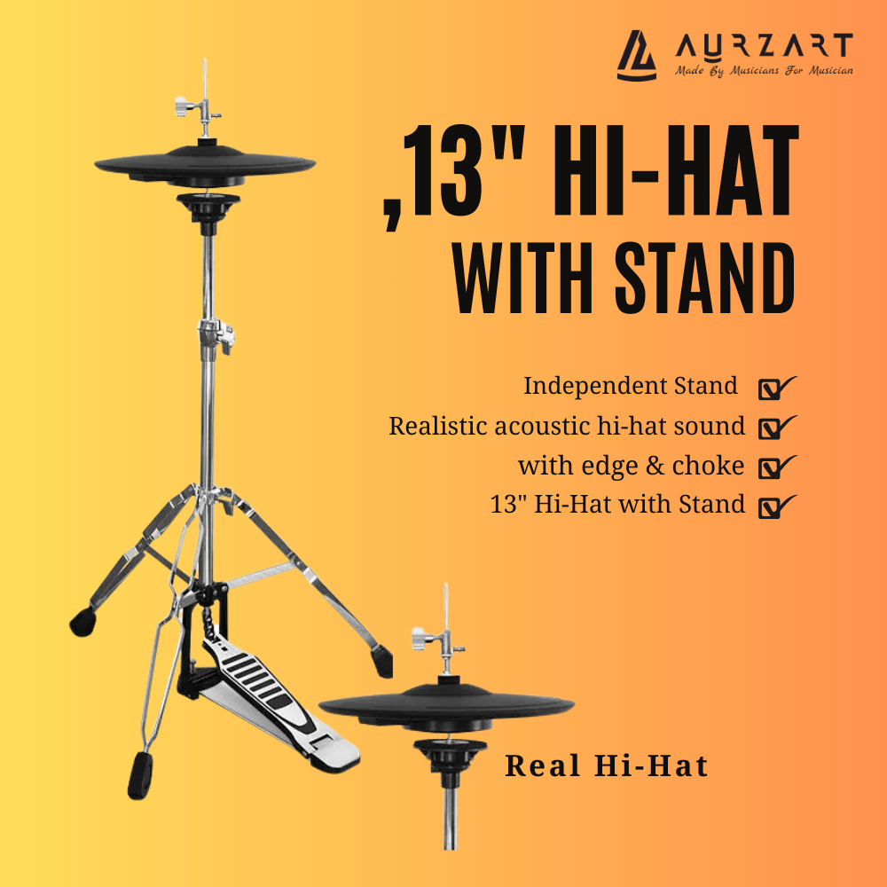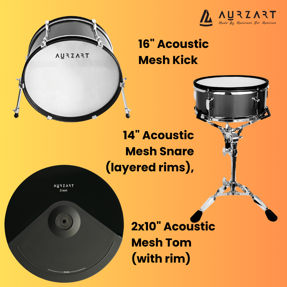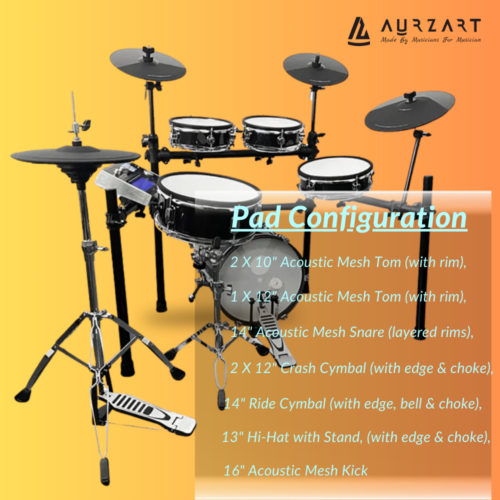 1 X 12" Acoustic Mesh Tom (with rim), 14" Acoustic Mesh Snare (layered rims), 2 X 12" Crash Cymbal(with edge & choke), 14" Ride Cymbal(with edge, bell & choke), 13" Hi-Hat with Stand(with edge & choke), 16" Acoustic Mesh Kick |